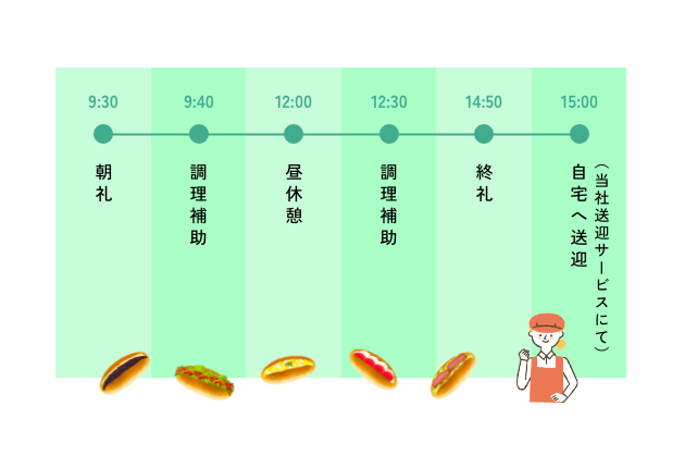 体験利用では、主に調理補助を通して、事業所の雰囲気を知っていただきます。利用時間はご本人のご希望に合わせて柔軟に設定いたします。